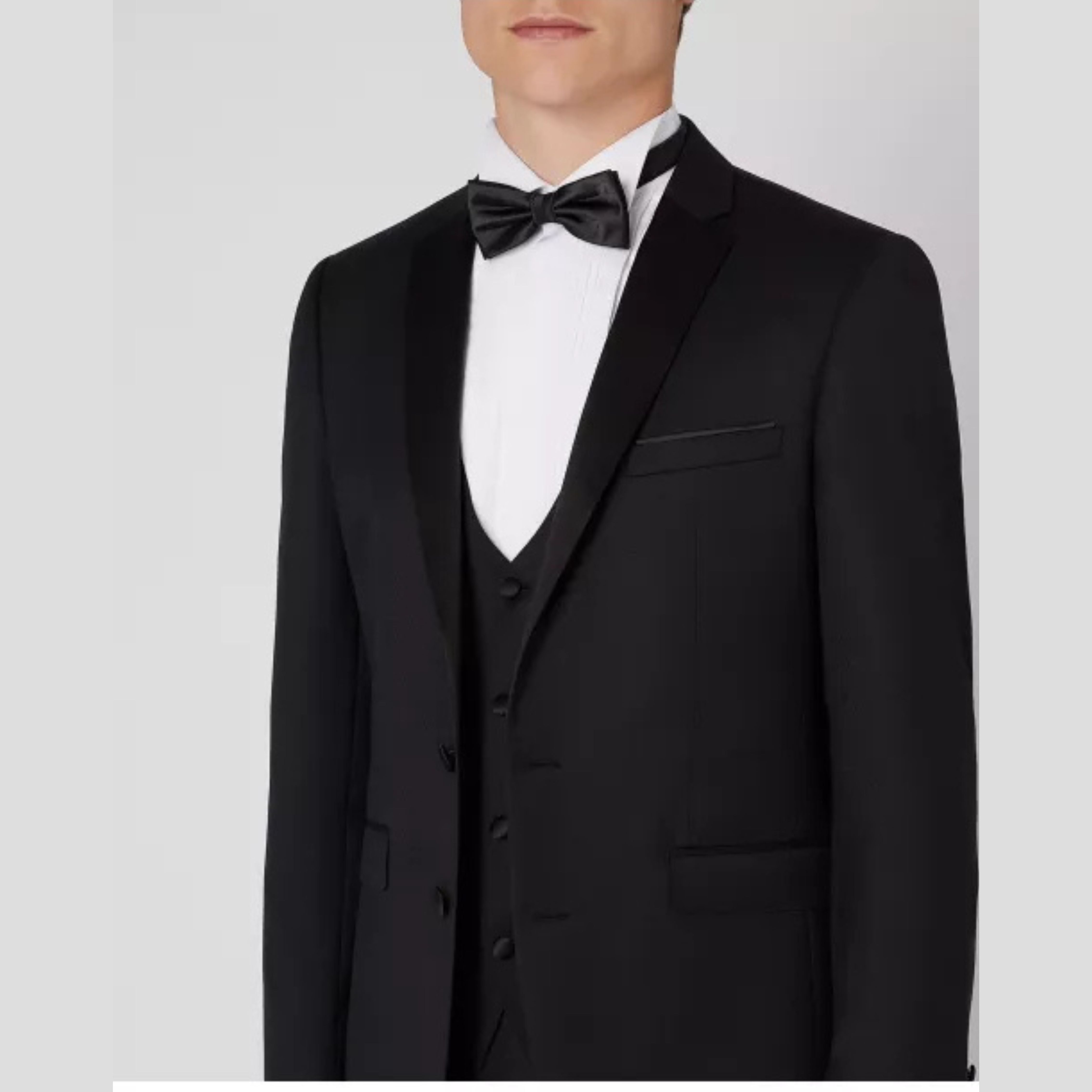 Black wool-rich mix and match suit with fabric interest and slim notched satin lapels. Single-breasted suit jacket, button two, jett flap side pockets, side vents and satin trim detailing.
