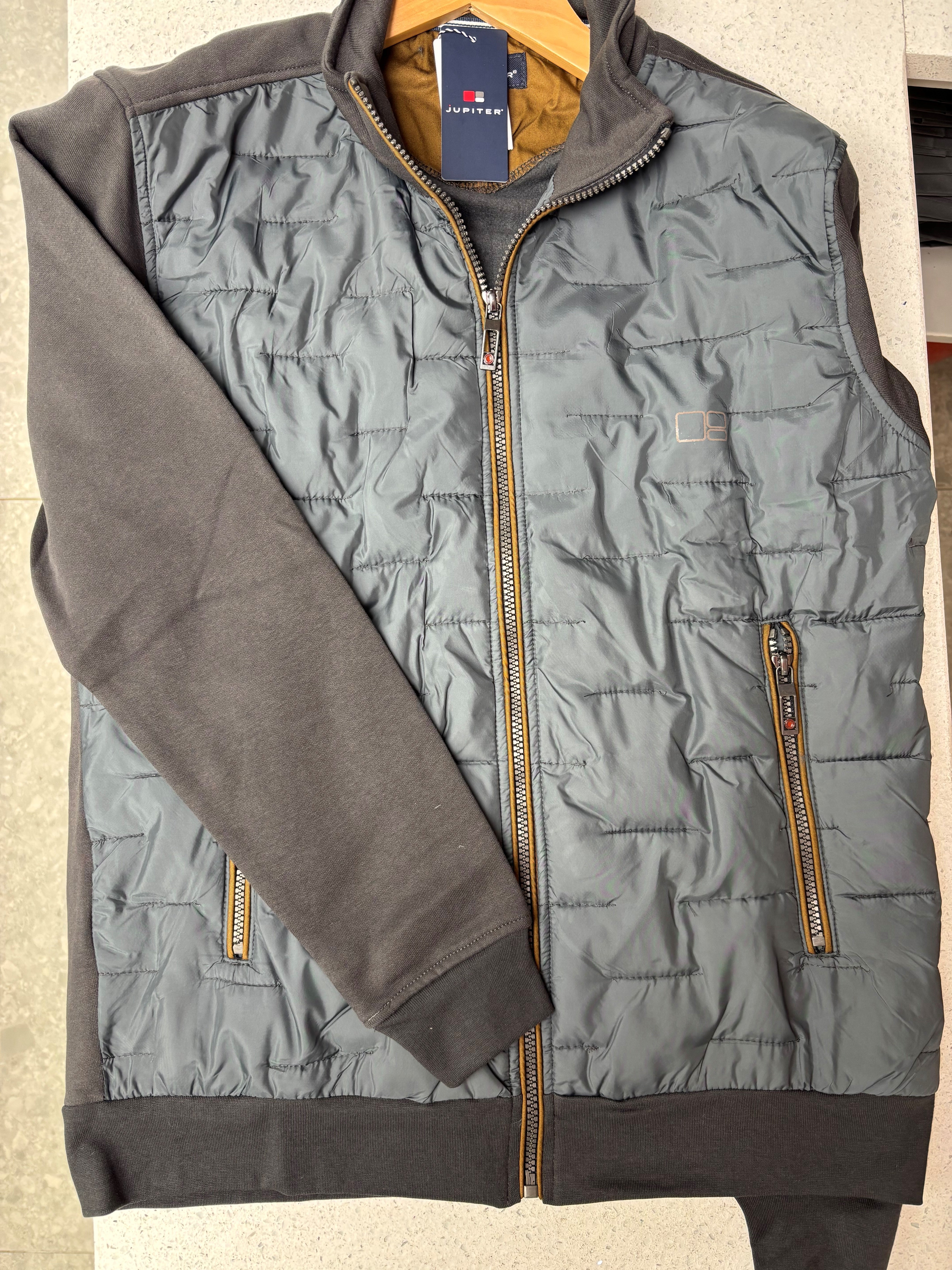 This Jupiter Hybrid Jacket in dark grey combines a cotton blend back and sleeves with a quilted front panel for enhanced warmth and comfort. Featuring two side zips and a full front zip accented with a distinctive brown lip, it offers both practical ventilation and a refined finish. Designed for versatile wear, this jacket is ideal for fluctuating weather conditions.