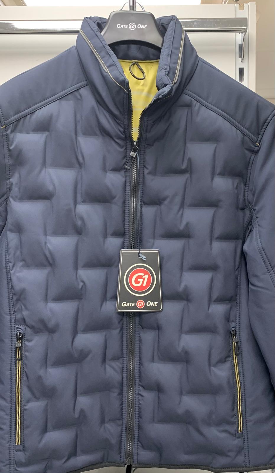 Gate One quilted jacket in Navy. Features two side zip pockets, one inside zip pocket, contrasting yellow zips and Gate One logo on left sleeve. Tapered fit.