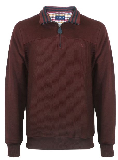 The Kessler 1/2 Zip Ribbed Sweater in Burgundy features a blend of cotton and polyester for durability and comfort. Its ribbed texture adds subtle style, while the contrast stripe on the collar provides a refined accent. The half-zip design offers versatility in wear and ease of layering, making this sweater a practical and polished choice for everyday use.