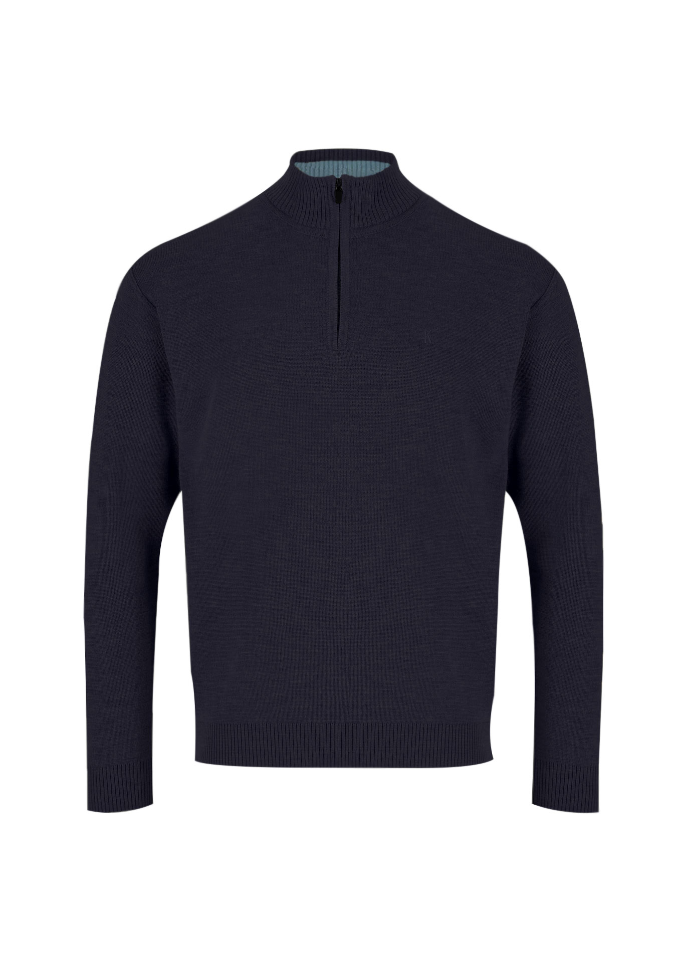 Kessler merino wool blend 1/4 zip sweater in Navy Features embroidered logo, textured finish and navy lining inside collar. Machine washable.