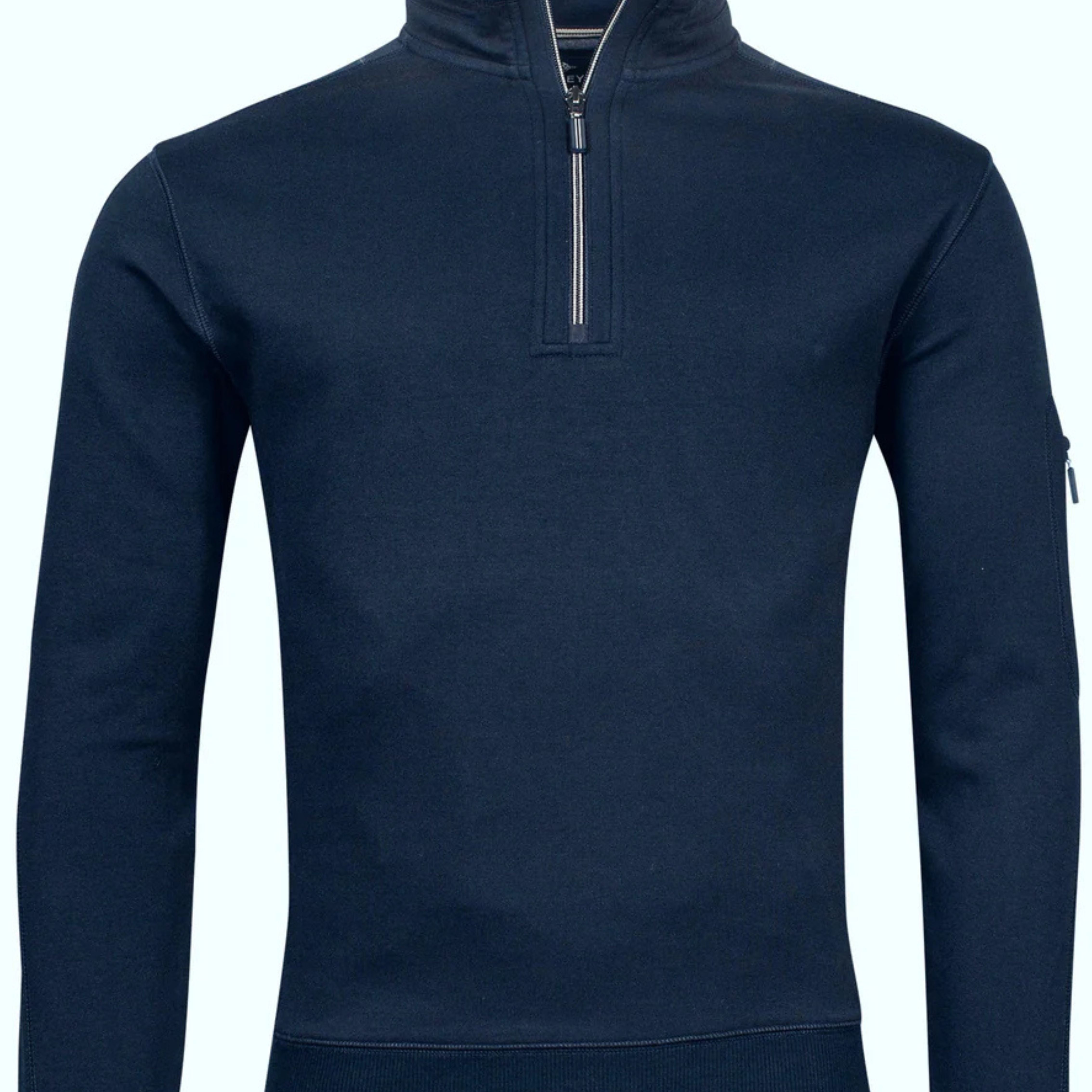 The Baileys 1/4 Zip Sweater in Navy is crafted from cotton rich fabric, ensuring natural softness and breath ability. Its modern fit offers a tailored yet comfortable silhouette, ideal for layering or wearing alone. The quarter-zip design provides adaptable coverage, blending practical functionality with a sleek, contemporary style. Perfect for those seeking quality and refined simplicity in their wardrobe.