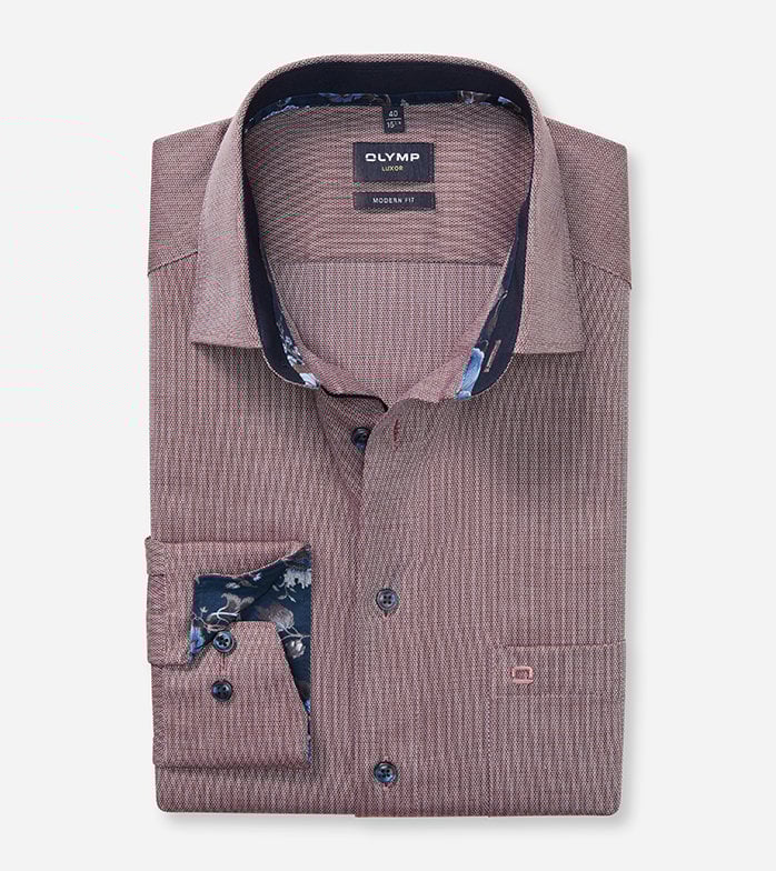 The Olymp Luxor Modern Fit shirt in Wine combines a sleek, solid colour with a fine weave and a distinctive New Kent collar, perfect for a polished, contemporary look. Crafted from breathable, non-iron cotton, it offers comfort and easy care throughout your busy day .